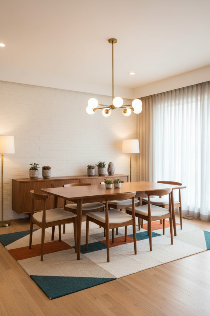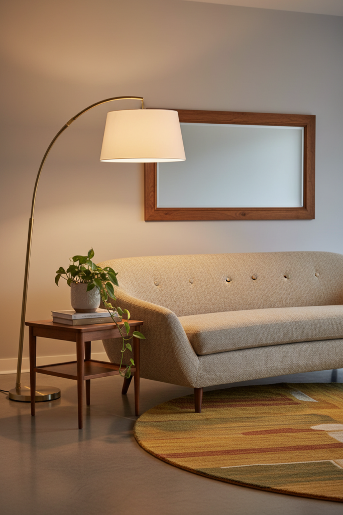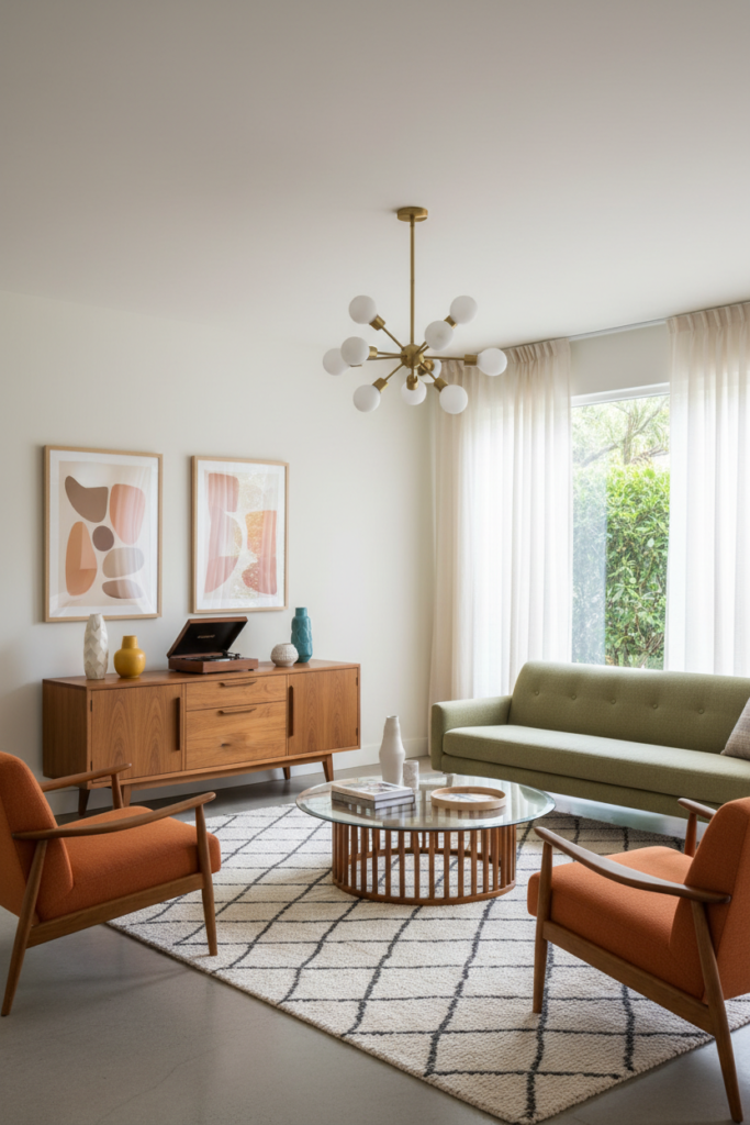 Mid century spaces require layered lighting for warmth.