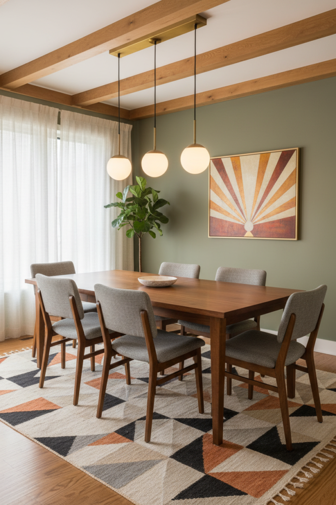 Mid century dining lighting often features globe pendants or starburst chandeliers.