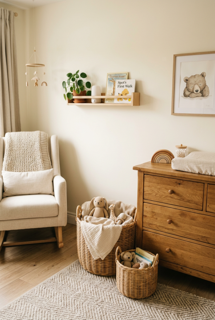 Place woven baskets on shelves or beside the dresser to hold toys, blankets, or extra clothes. Materials like rattan, wicker, or seagrass work beautifully in neutral rooms.