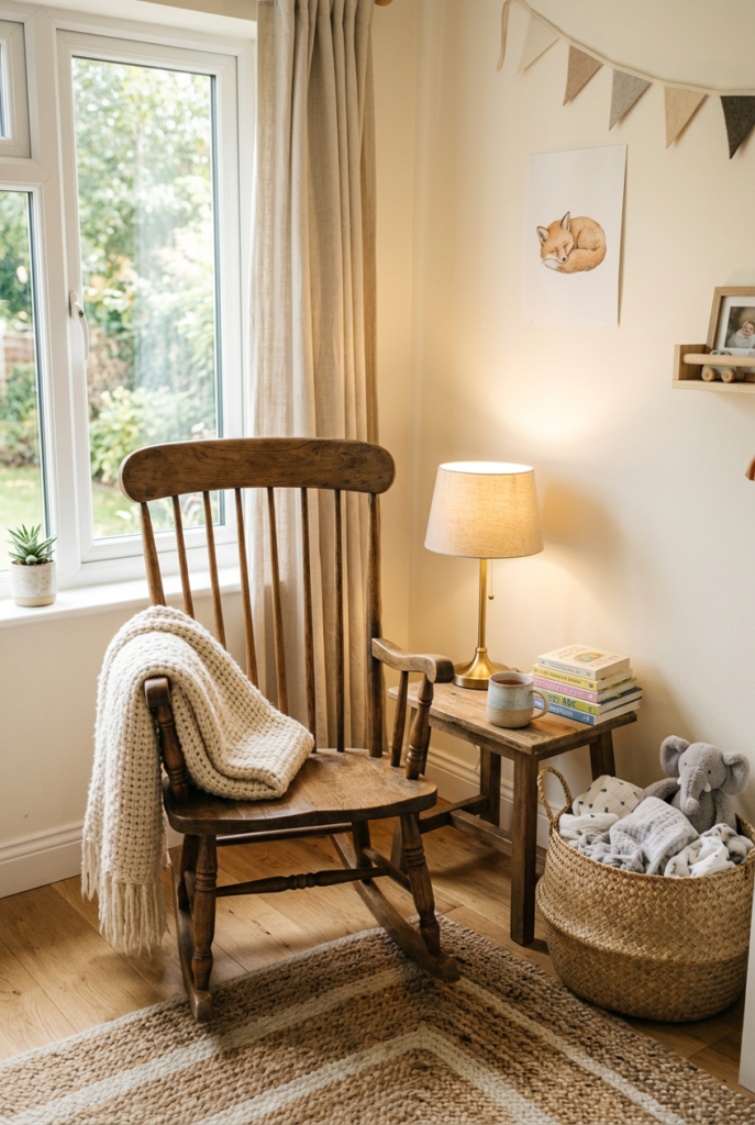 Place a rocking chair or glider near a window if possible. Add a small side table and a warm table lamp for nighttime feedings.