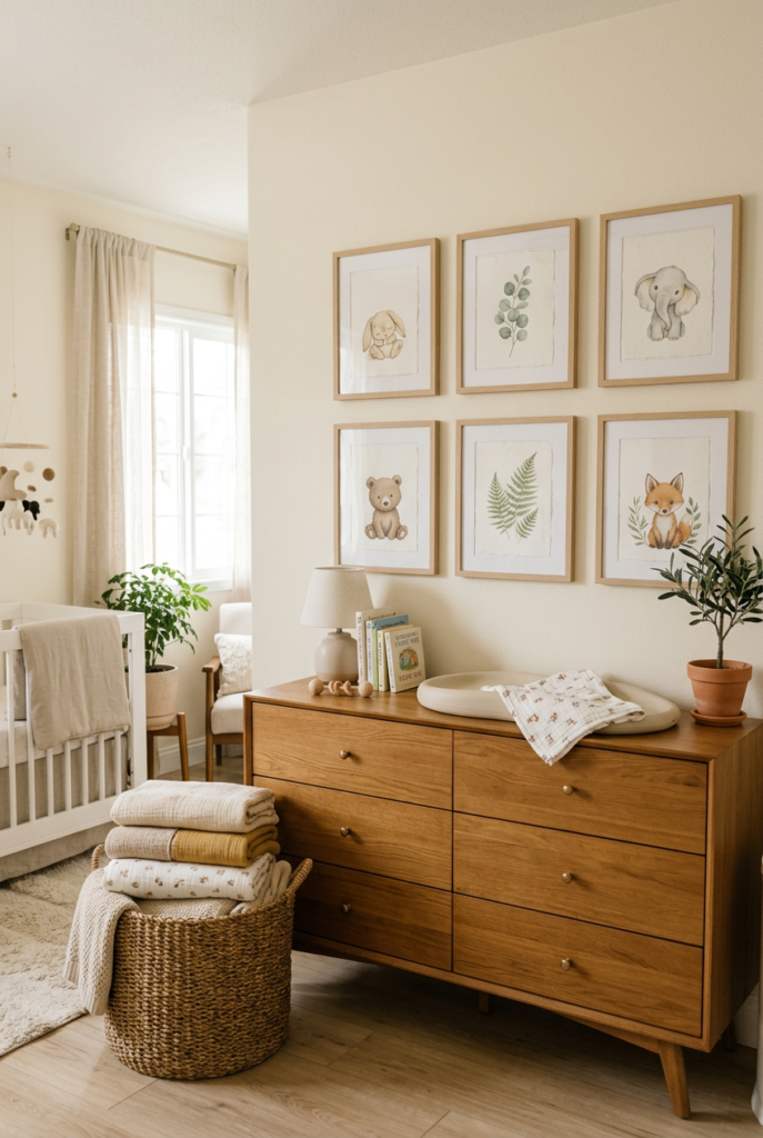 Choose artwork with soft animal illustrations, botanical prints, or minimal line drawings. Use light wood or natural frames to keep the look cohesive.