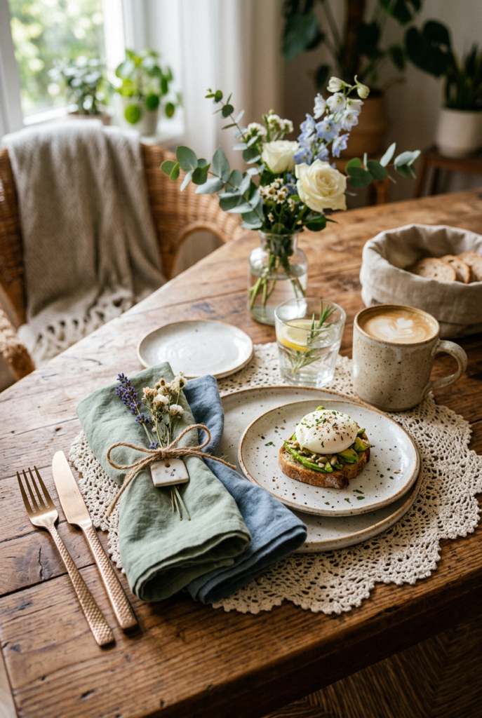 Choose cotton or linen napkins in muted shades like sage green, dusty blue, or warm beige. Fold them loosely beside each plate.