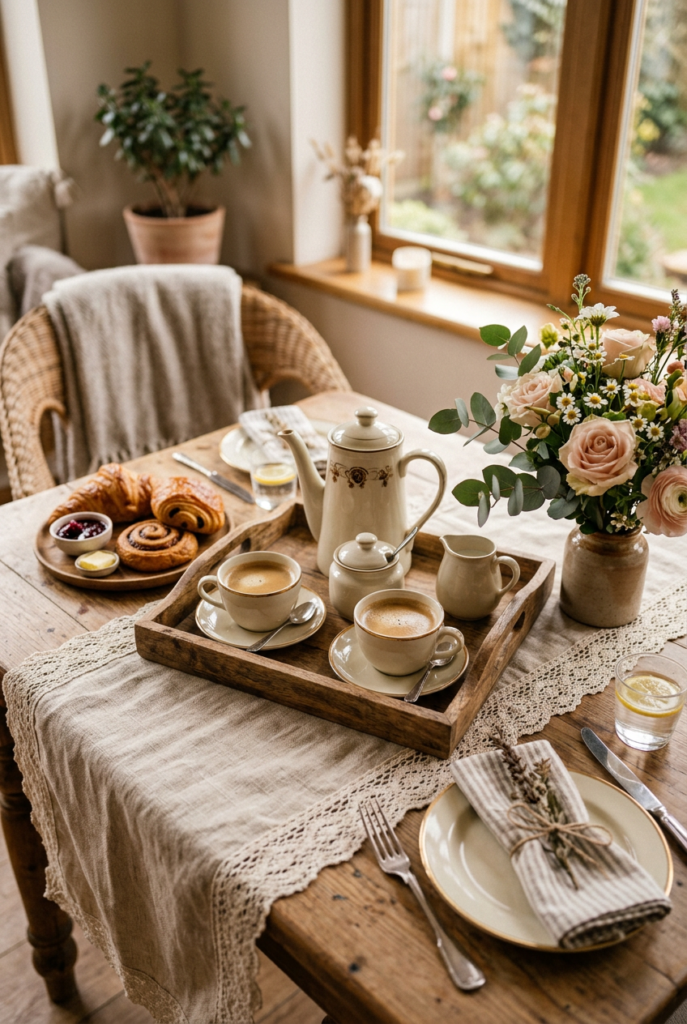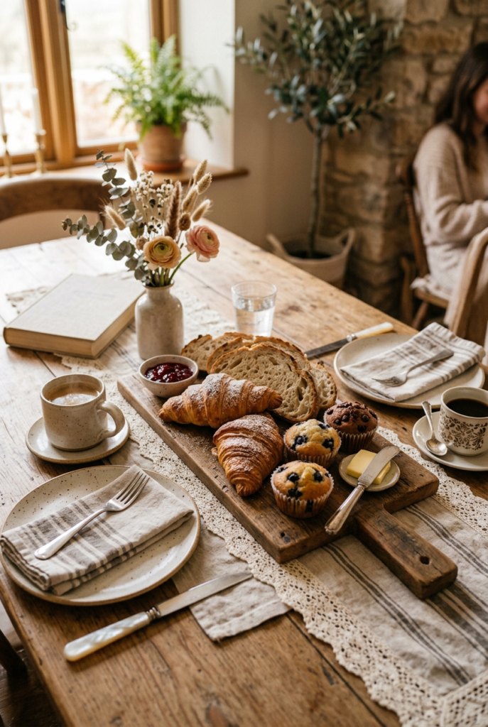 A linen runner, a few flowers, or a basket of pastries can completely change the mood of the table.