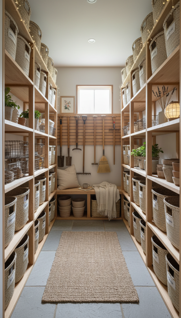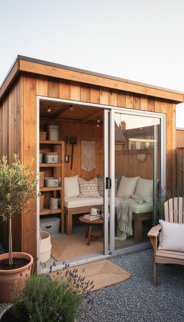 Start with soft textures and natural materials. Wood finishes, woven baskets, and simple textiles instantly add warmth and character, even in very small spaces. These elements help the shed feel more like a room than a utility structure.