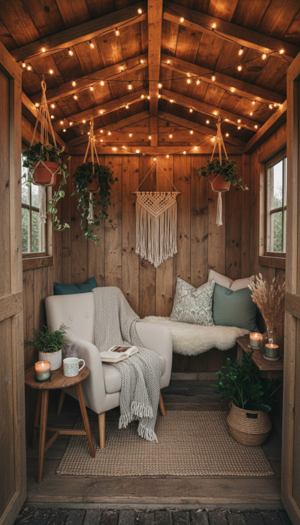 Lighting also plays a huge role. String lights, wall sconces, or even a small table lamp can completely change the mood of the shed. Warm lighting creates an inviting atmosphere and makes the space usable beyond daylight hours.