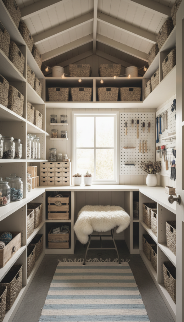 Choosing a light and cohesive color palette also makes a big difference. Soft neutrals, warm whites, or muted natural tones help small spaces feel calmer and more open. Too many contrasting colors or heavy finishes can make a shed feel crowded very quickly.