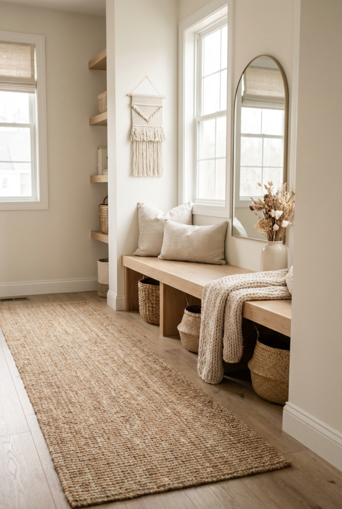 Use woven baskets, a soft runner rug, and linen or cotton accents. The space feels calm and cohesive.