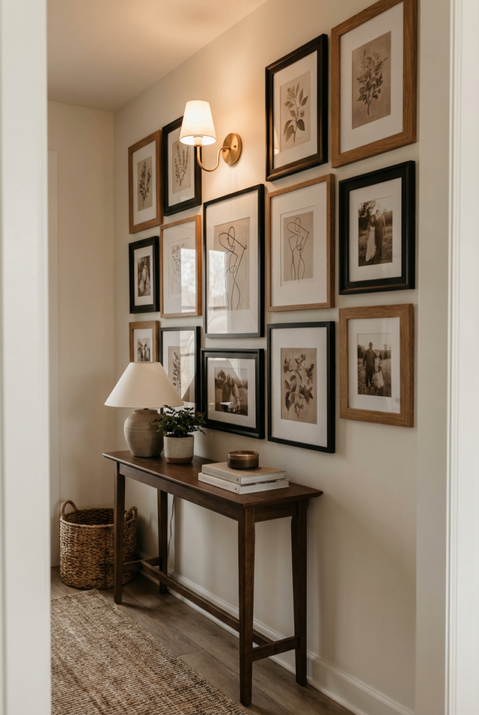 Create a simple gallery with warm wood or black frames. Keep spacing consistent and the color palette cohesive.