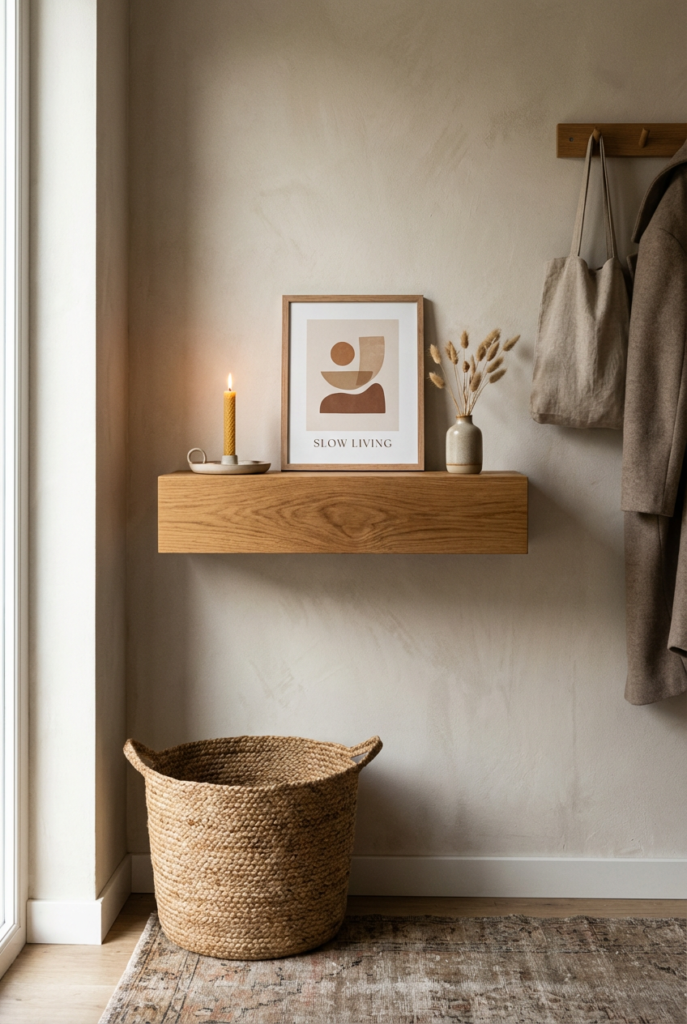 Choose a thick wood shelf in a warm tone. Keep styling minimal — a small tray, a candle, and a framed print.