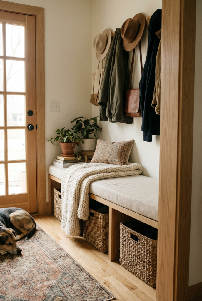 Below the hooks, add a small bench or a narrow shelf. This creates structure while maintaining warmth.