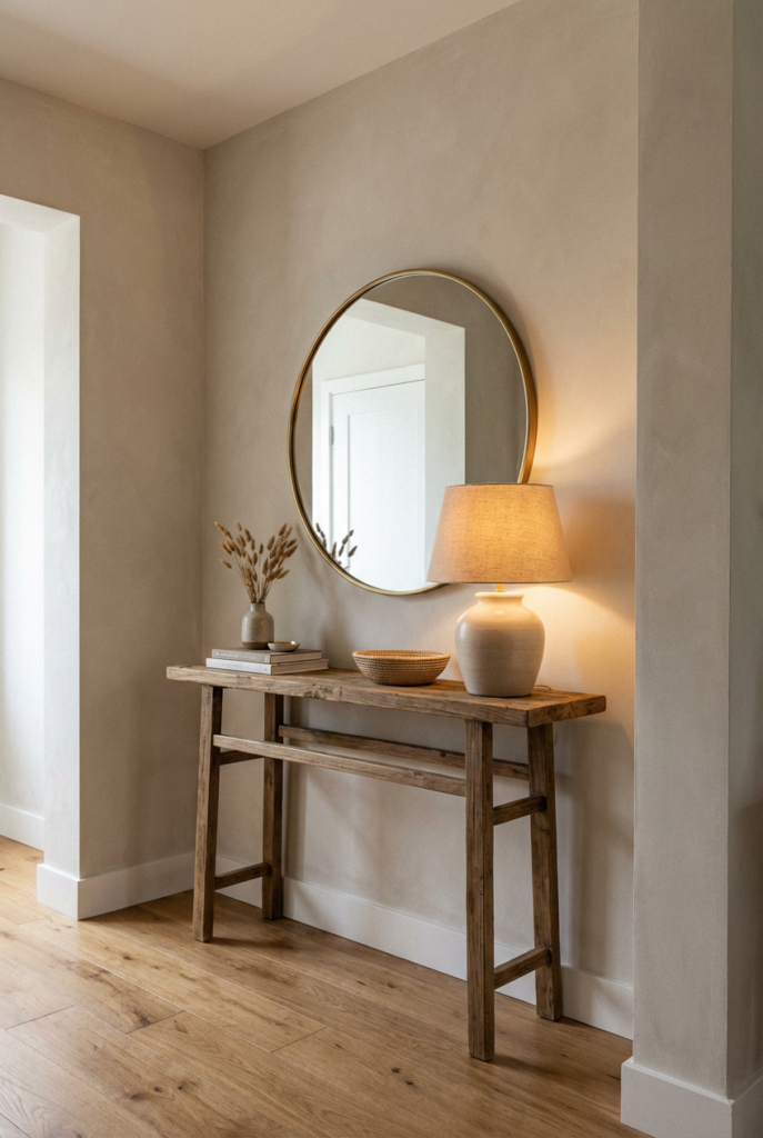 Hang a round or softly framed mirror above a console. Choose warm wood or black frames for subtle contrast.