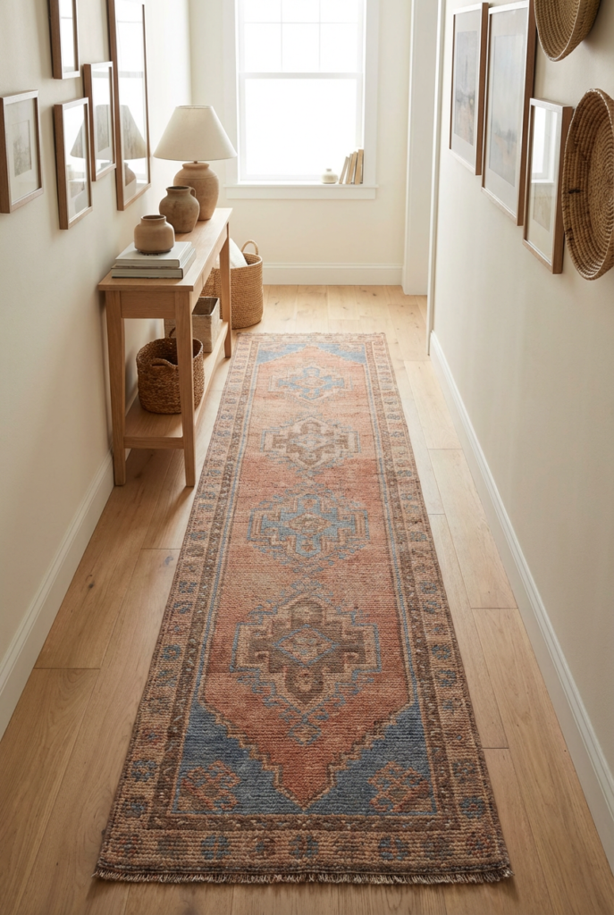 Choose one with subtle patterns or warm tones like terracotta, muted blue, or soft brown. Make sure it’s long enough to guide the eye down the hallway.