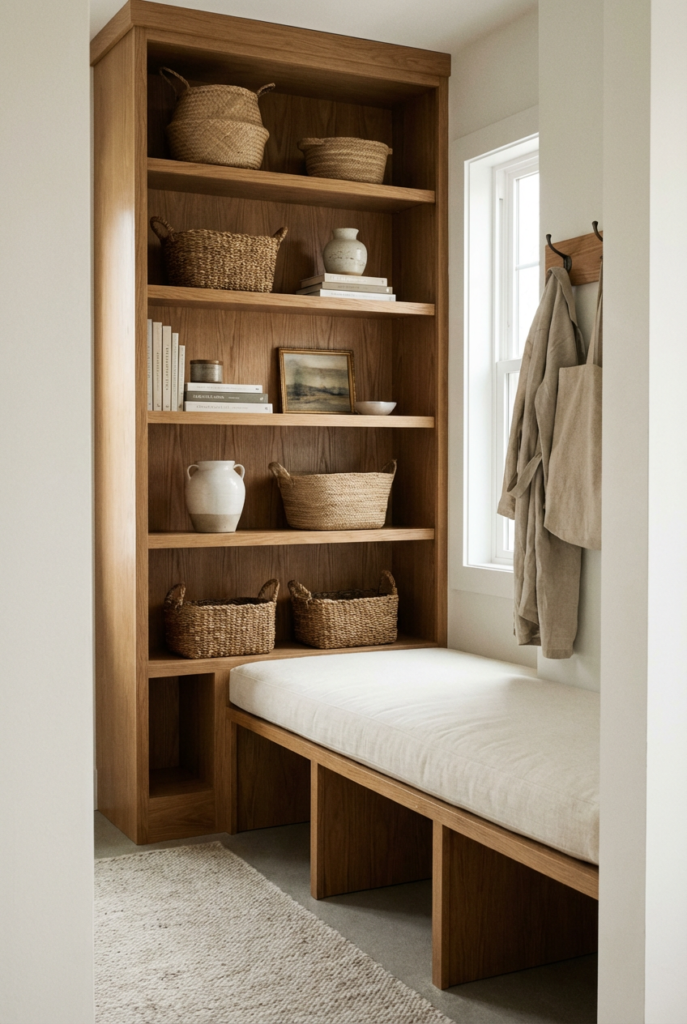 Use vertical shelving above a bench or cabinet. Keep shelves lightly styled with baskets, books, and small decor pieces.