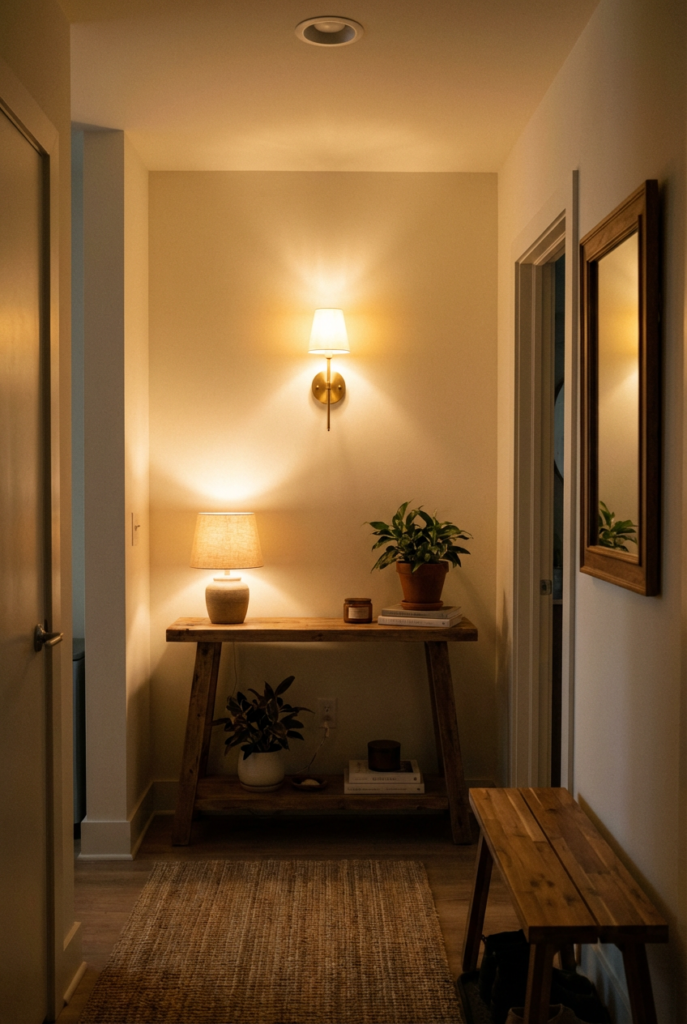 With soft light, warm textures, and thoughtful layout, even the smallest space can greet you with comfort. It becomes more than just a pass-through area.