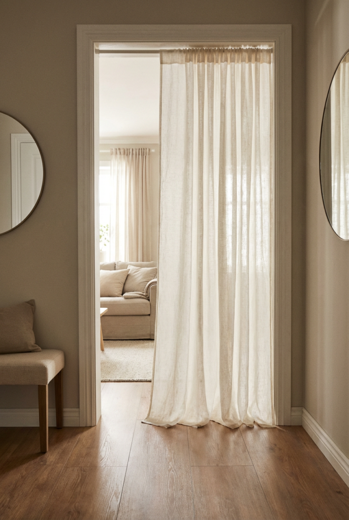 Hang a soft curtain panel to define the entry zone. Stick to neutral tones like off-white or sand.