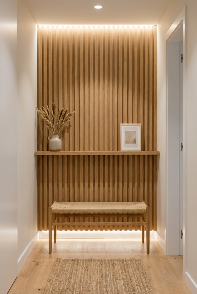 Even if it’s just a narrow wall or a few feet by the door, it can still feel warm and welcoming. The right layout, soft lighting, and thoughtful textures can turn a small, overlooked space into something that feels intentional.