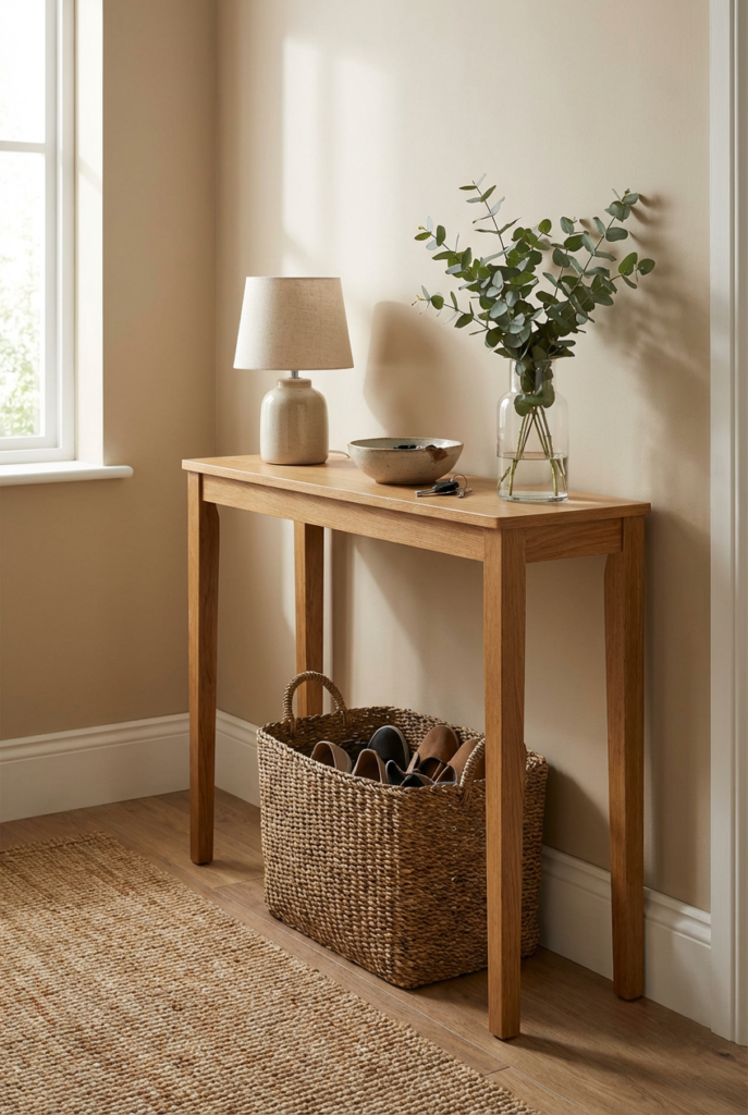 Style it with a small table lamp, a ceramic bowl for keys, and a simple vase with greenery. Add a woven basket underneath for shoes or bags to keep the space tidy but cozy.