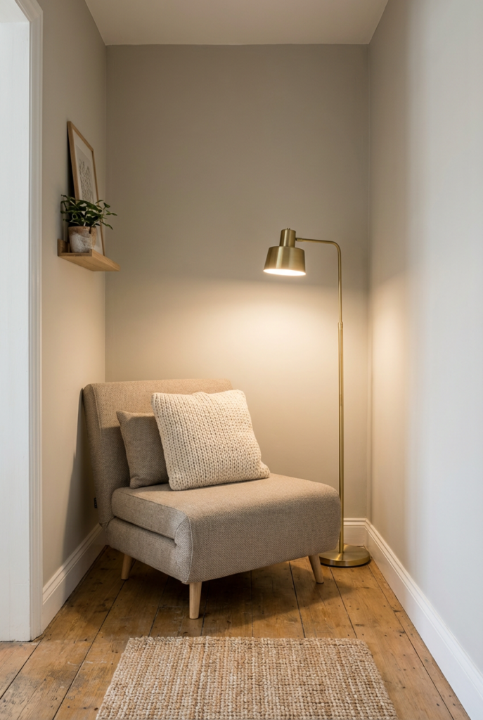 Place a compact chair or a small bench angled slightly toward the room. Add a textured pillow for warmth.