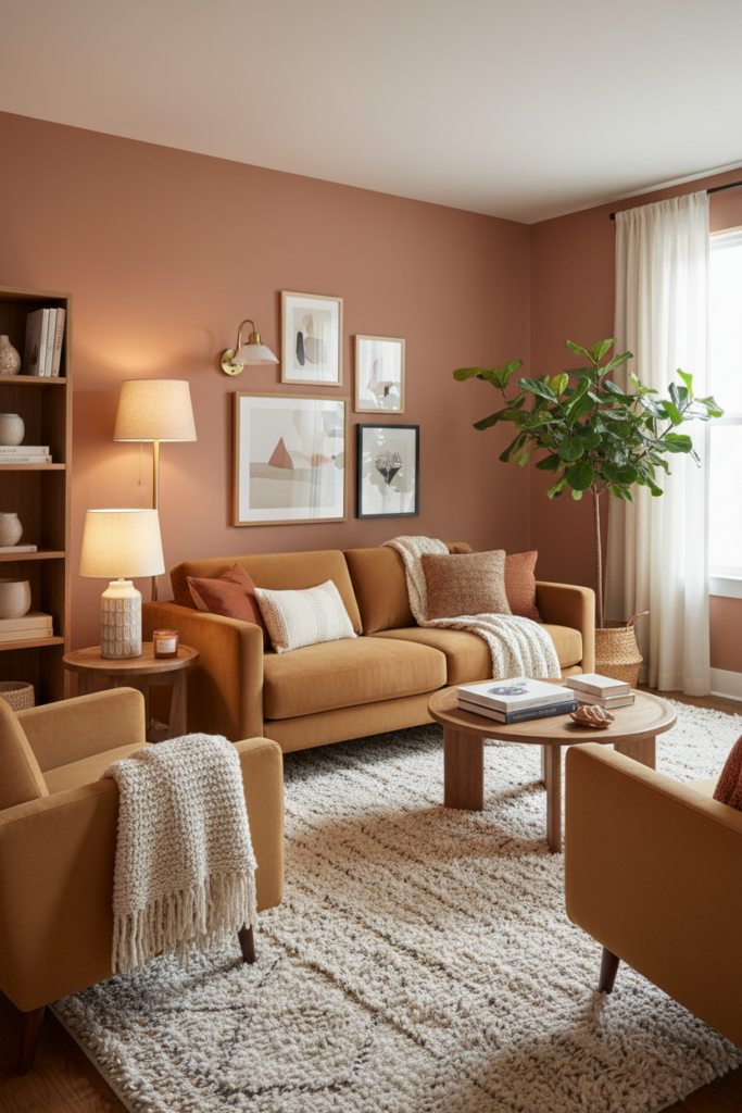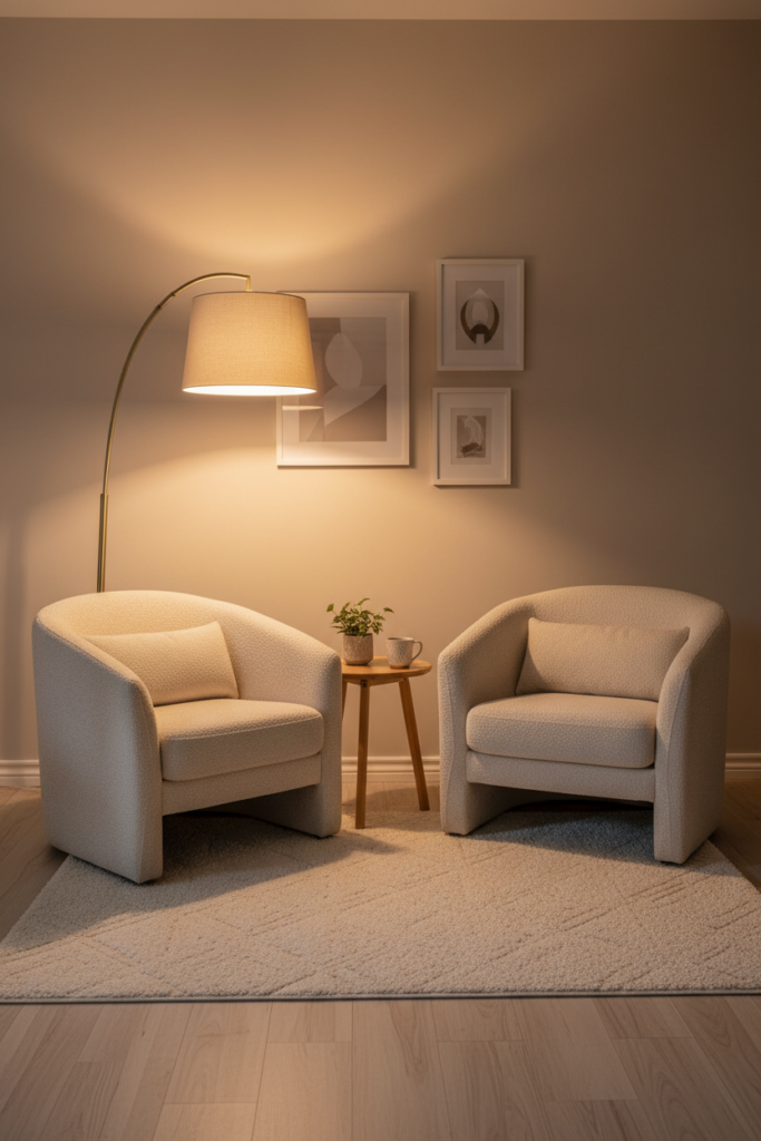 Use a small table between them and focus on comfort. Add layered lighting with a floor lamp behind the chair and a table lamp on a nearby surface. Keep the palette warm and muted to avoid visual clutter.