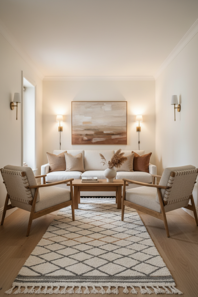 A rug is essential here. It visually anchors the floating layout and prevents it from feeling disconnected.