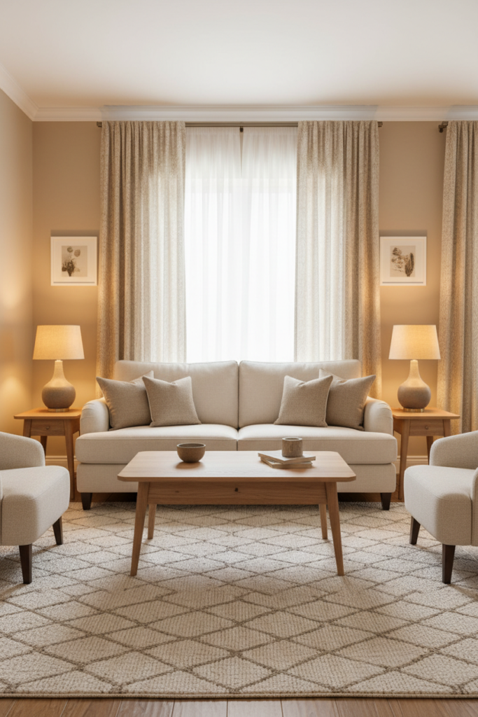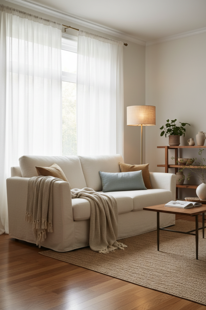 Then add warmth through textiles.A thick rug, layered cushions, and soft curtains that reach the floor can make the room feel complete without adding visual weight.