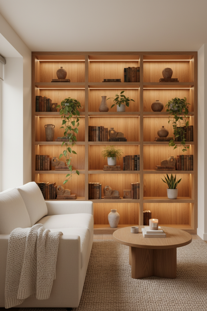 Add warm lighting that mimics the softness of natural light. A table lamp, a floor lamp, or even a soft wall light can make the room feel calm and inviting at night.