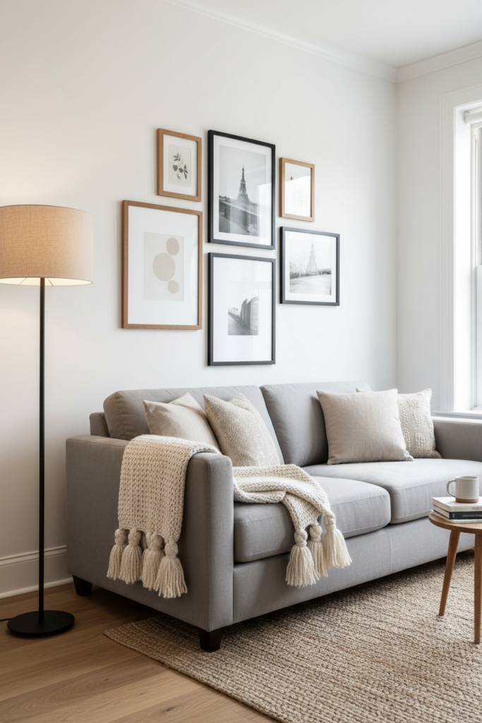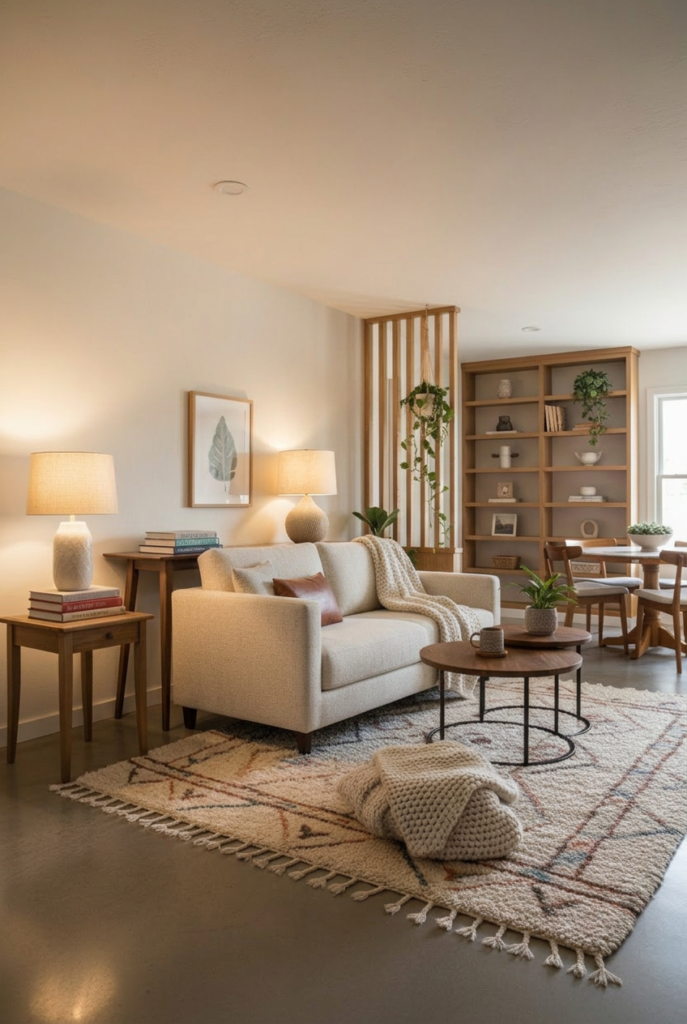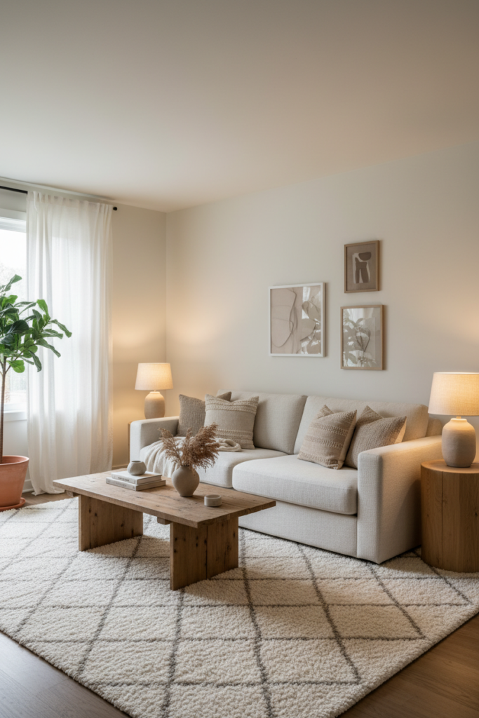 Then focus on texture. Boucle, linen, woven baskets, and layered textiles can make even the simplest layout feel rich and inviting.