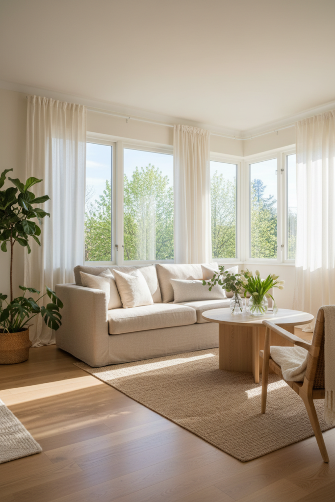 Pull curtains fully open during the day. If you use heavy drapes, consider swapping them for sheer or linen panels in warm white.
