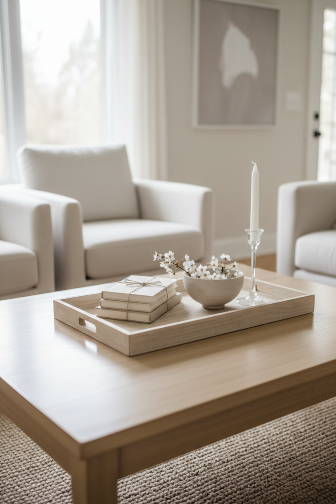 Clear your coffee table and restyle it with fewer items. Use a light wood tray, a small stack of neutral books, and a simple bowl.