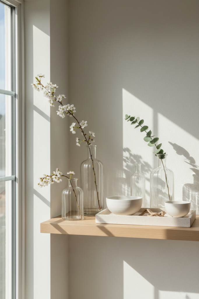 Use clear glass vases, ceramic bowls in soft white, or light stoneware trays. These pieces feel clean and fresh.