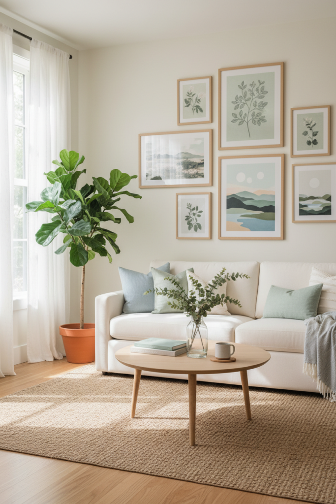 A small gallery wall in fresh tones can completely shift the mood without changing anything else.