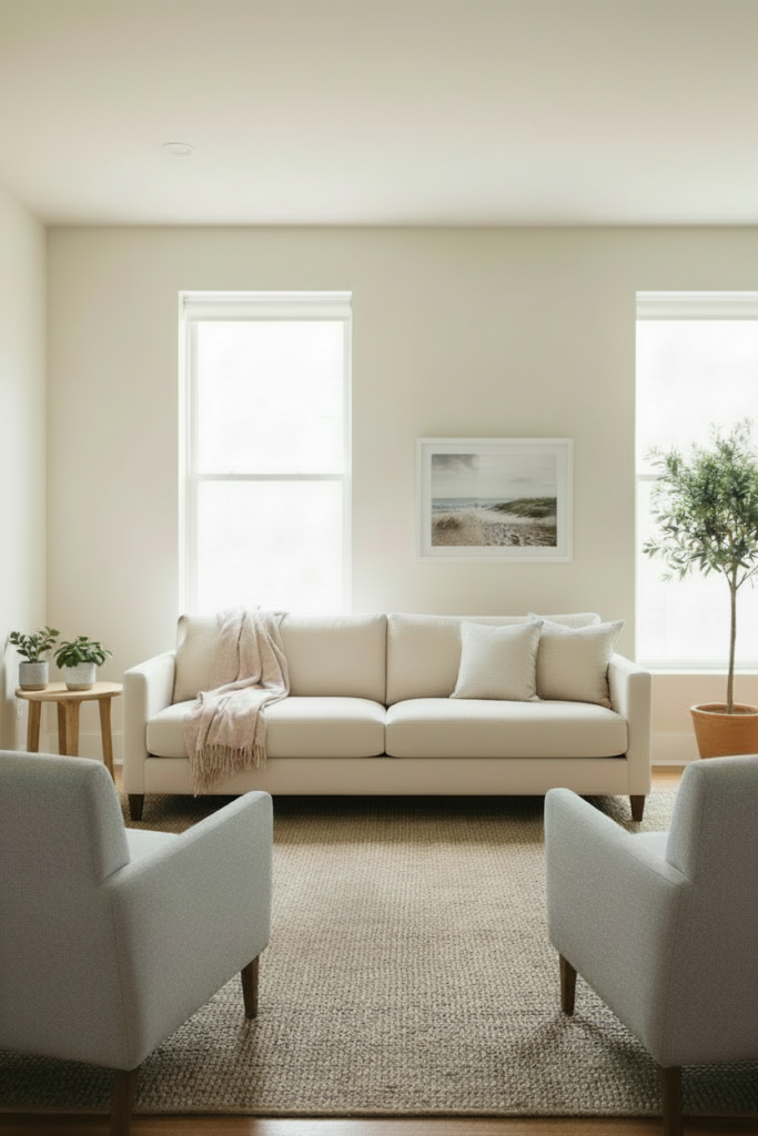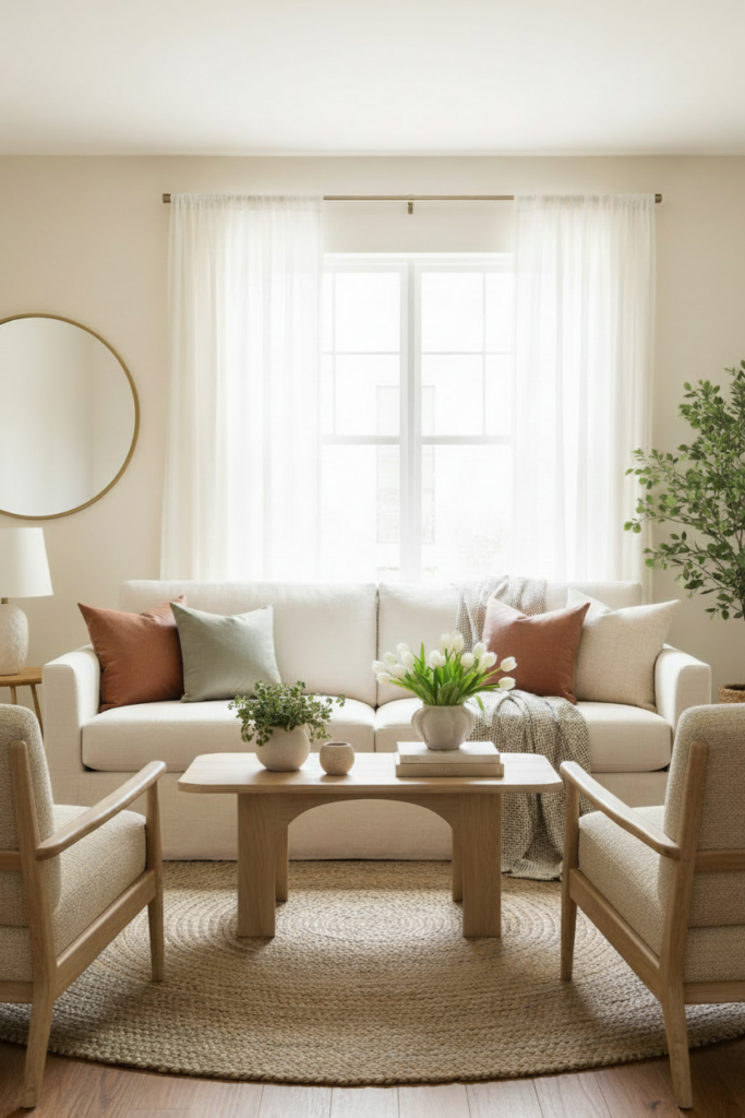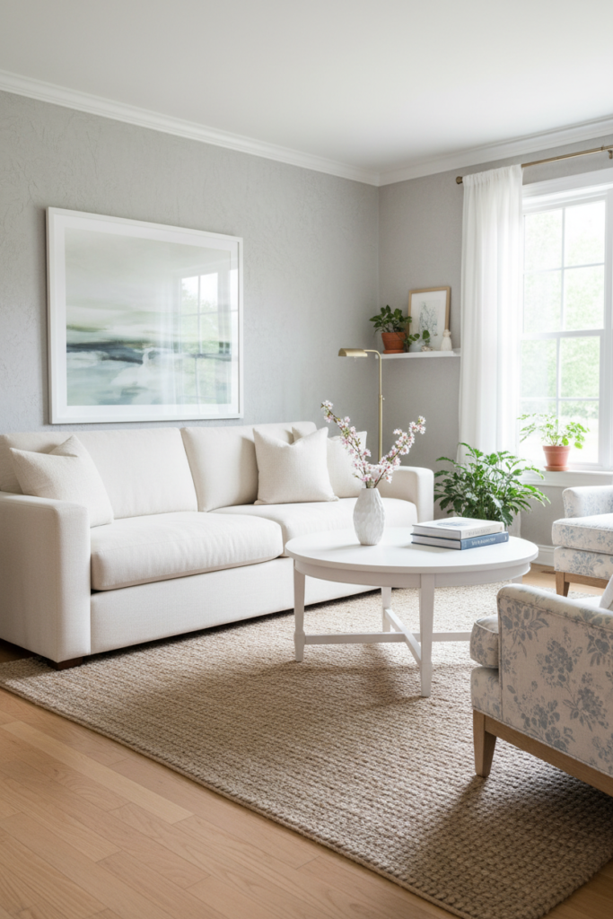 Add one lightweight throw, two balanced pillows, and one small floral arrangement.