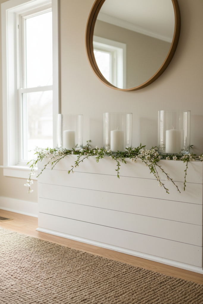 Drape a delicate greenery garland across the mantel. Let it fall naturally rather than positioning it perfectly.