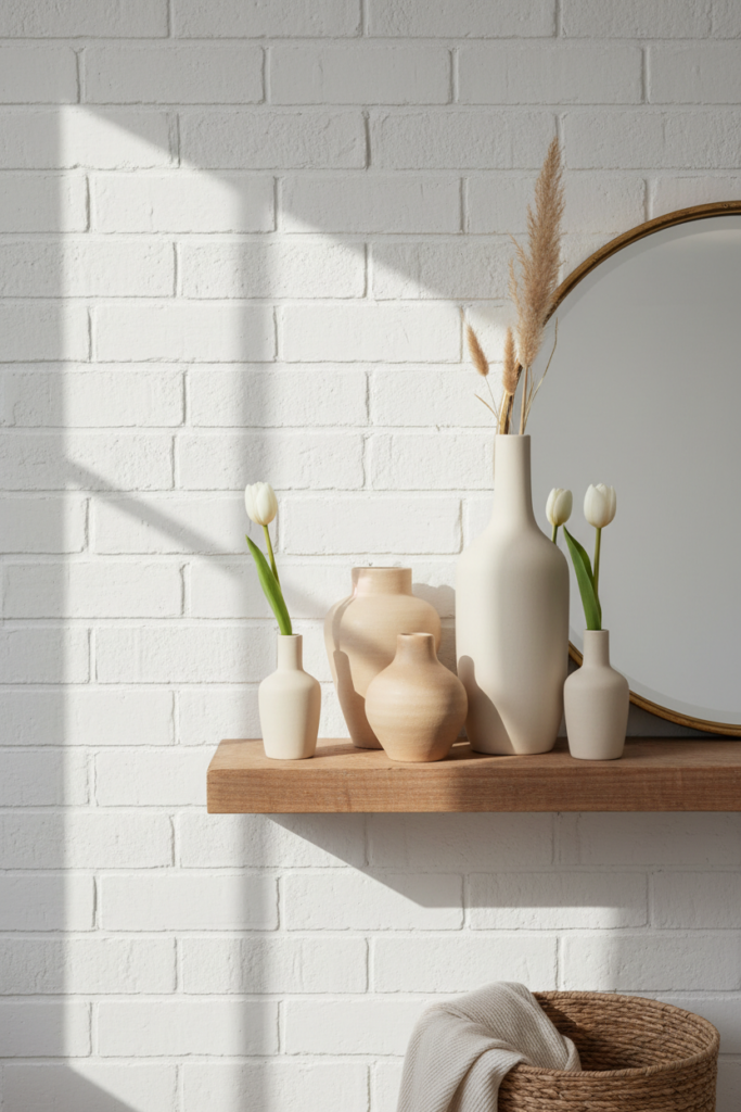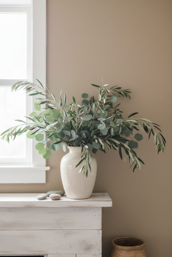 Place a tall ceramic or glass vase slightly off-center. Fill it with eucalyptus, olive branches, or soft spring blooms.
