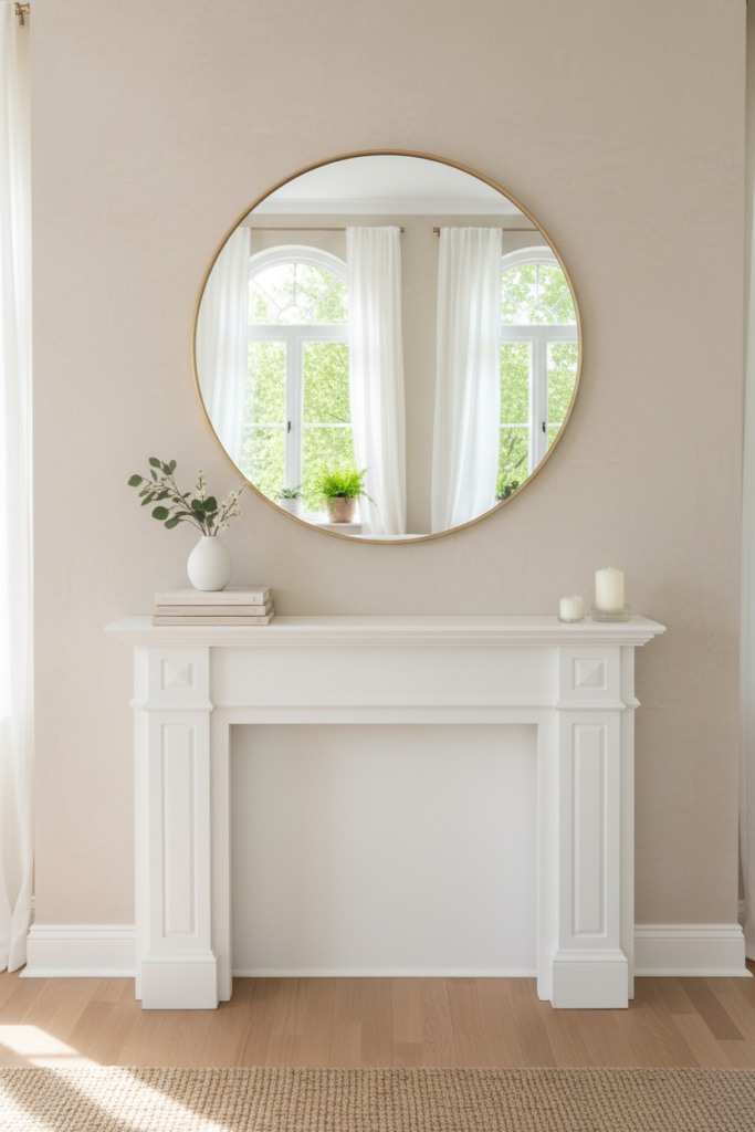 Lean a large round or arched mirror against the wall above the mantel. Choose a light wood or thin brass frame to keep the look airy.