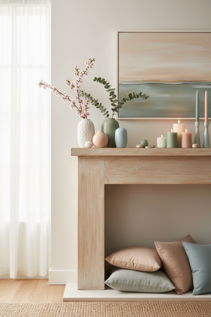 Choose a simple palette of warm white, soft blush, muted sage, and pale blue. Repeat these tones in artwork, vases, or candles.