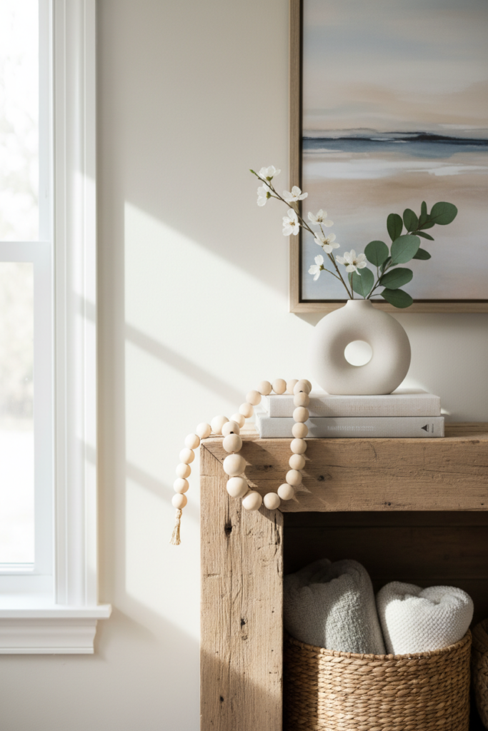 Drape a light wood bead strand across a stack of books or around a vase. Choose pale wood rather than dark stains.