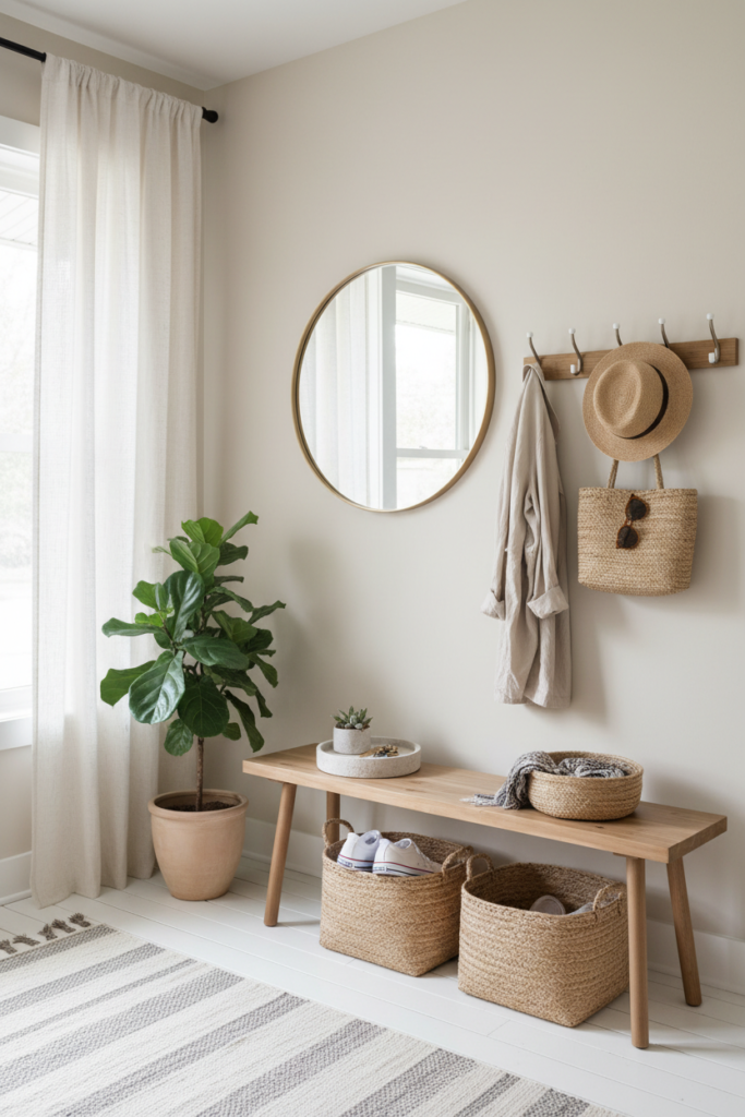 Next, focus on creating a functional drop zone. Hooks, baskets, or small trays can help contain everyday essentials like keys, sunglasses, wallets, and mail. The goal is to give each item a designated place so nothing ends up scattered.