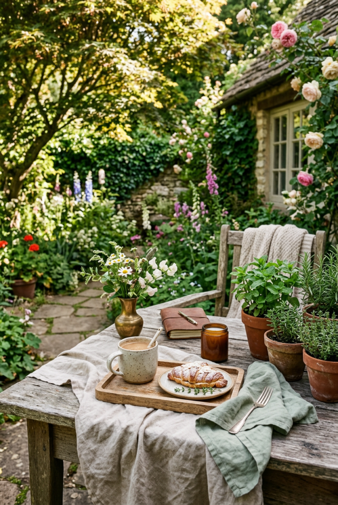 Place a tray on the table for morning coffee. Keep a favorite outdoor mug nearby. Add a small wind chime for soft background sound.
