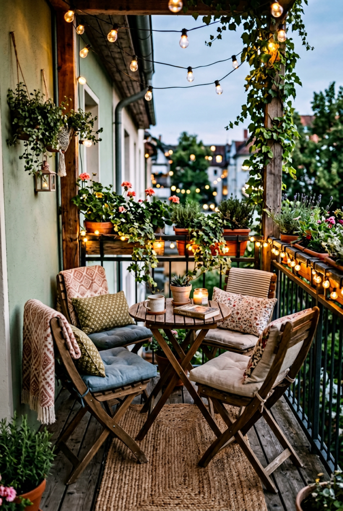 Even a balcony with two chairs and a small table can feel like a retreat when layered with textiles and soft light.
