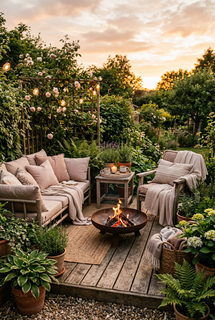 When seating is gathered closely, light glows gently, and greenery frames the edges, the space feels private and welcoming.
