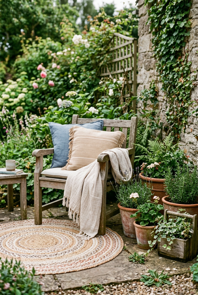 Add an outdoor rug beneath the seating area to ground it. Choose woven textures in natural shades like sand, soft gray, or muted terracotta.